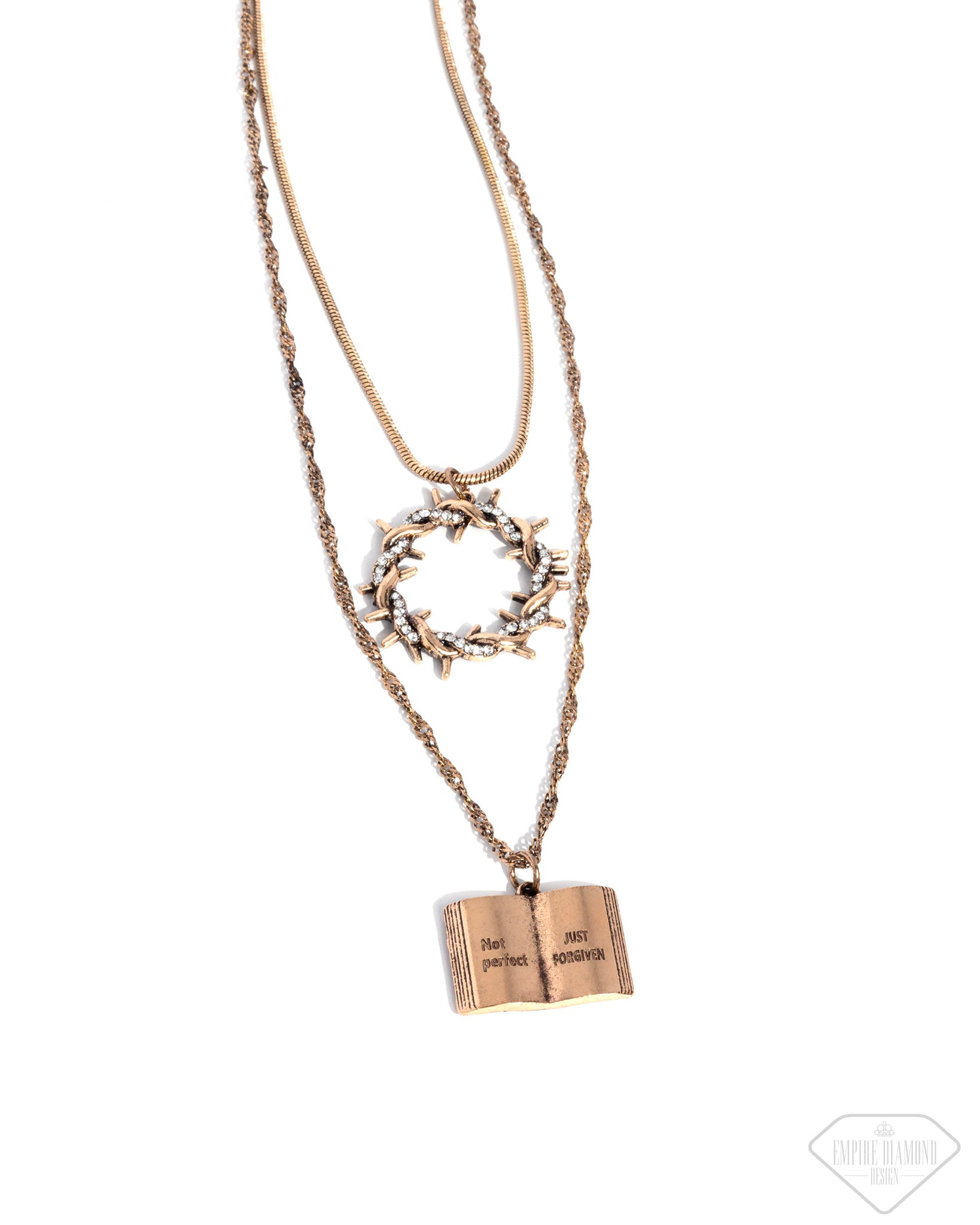 Sporadically dusted in dainty white rhinestones, antiqued gold bars curl into a crown of thorns pendant, gliding along an antiqued gold snake chain. An open book with the words "Not perfect JUST FORGIVEN" stamped atop it glides along an antiqued gold singapore chain, layering below the wreathed pendant for a reverent, radiant reminder. Features an adjustable clasp closure.