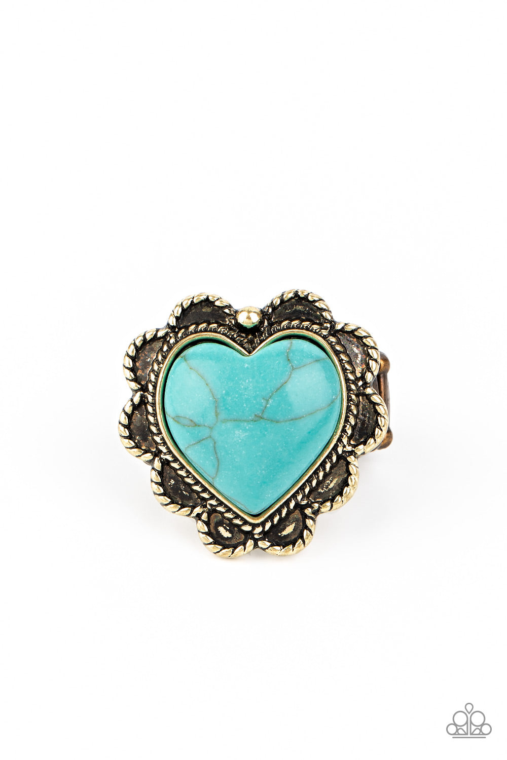 Chiseled into a charming heart, a refreshing turquoise stone is pressed into a scalloped brass frame radiating with antiqued rope-like texture for a romantically rustic look. Features a stretchy band for a flexible fit.